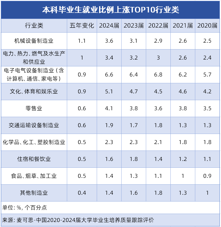 该专业是机械类的保守王牌专业,焦点是培育控制机械设想、制制工艺和从动化节制等分析能力的手艺人才。学生将进修若何设想合适需求的机械产物,优化出产工艺流程,处理出产中的手艺难题,具备从产物研发到出产落地的全流程参取能力。 报考需具备结实数学、物理根本,力学学问尤为环节。升入大学后需注沉实践,积极参取尝试、工业练习取学科竞赛,考取CAD工程师认证提拔合作力。就业面广,可入职汽车制制、工程机械、航空航天等企业,处置机械设想、工艺、设备办理等岗亭,需留意部门岗亭需驻厂或深切车间,工做相对艰辛,做息需贴合出产节拍,报考前可提前领会。 机械设备制制业是支持国平易近经济成长的主要根本财产,智能化、绿色化转型,笼盖工业出产、根本设备扶植等多个环节范畴,高端配备制制、细密仪器研发等标的目的对本科手艺人才的需求持续攀升。 这10个行业类的分布特征明显:制制业相关行业占领从导,涵盖机械设备、占TOP10中的6席。这一态势表现了我国制制业转型升级成效,高端配备制制、电子消息等焦点范畴对专业本科人才需求兴旺。同时,能源保障、消费升级、平易近生办事等类行业的稳步增加,也为大师将来职业选择供给了更多元标的目的,这些增加显著行业对应的专业范畴,值得沉点关心。 对于面对升学选择的高中生而言,专业的挑选关乎将来的职业成长轨迹。领会当下及将来的就业趋向,找准那些人才需求兴旺、成长潜力凸起的行业,近五年,我国本科结业生就业市场一批行业类凭仗强劲的成长动力,成为吸纳结业生的主要阵地。接下来小优将为你细致解读就业比例上涨TOP10行业类,找准适配的专业标的目的,为你的升学规划供给参考。