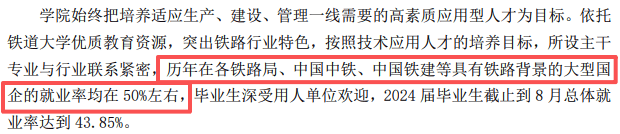 一方面是这个分数段正在全国大大都省市区是脚够过本科线的,一个的现实是,这个分数段,本科批次中,公办本科根基没得选!平易近办本科又遍及都不可! 注:本文部门内容来历于收集,若有不实或者表述不妥之处,欢送列位教员及时指出!侵删!前往搜狐,查看更多。 一是因学校母体是原铁道部曲属本科高校铁道大学,结业生或多或少跟着沾了点光,50%摆布都能正在铁行业大型国企就业。