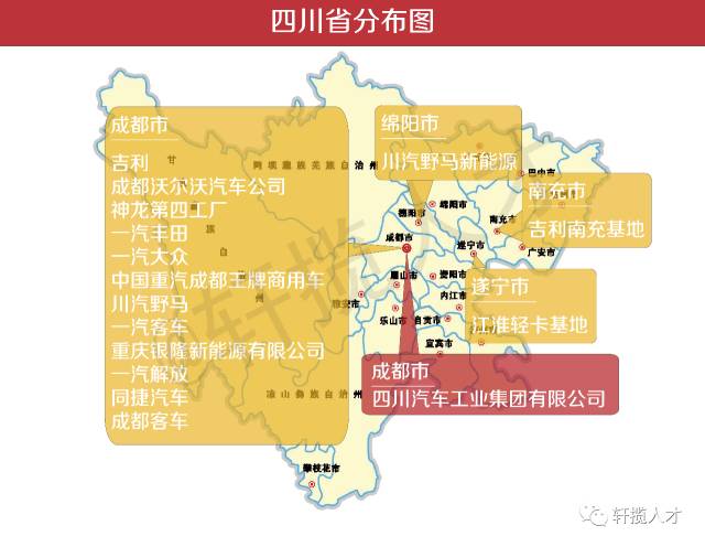 从这张分布图中能够看出,四川的车企出产制制核心次要集中正在成都这一块,成都的汽车财产次要集中正在龙泉驿何处,谈到成都的主要性,一汽公共汽车无限公司总司理安铁成已经说过:“成都是一汽公共继之后的第二个出产,它的建成对于一汽公共来说,其意义不只仅是产能的添加,更具有正在中国西部区域的计谋性感化。”。