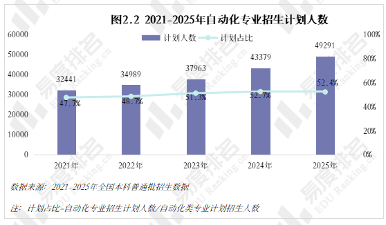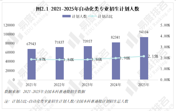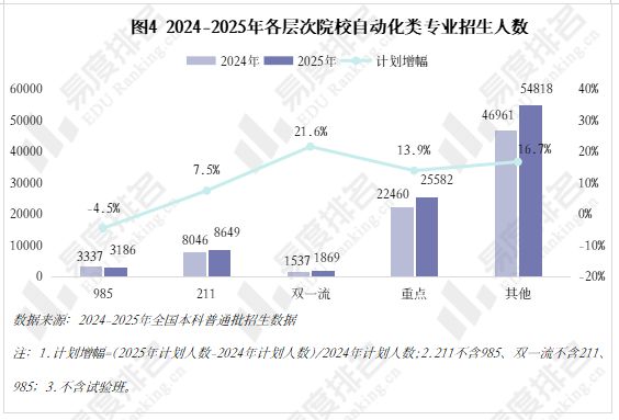 跟着智能制制的快速成长和工业4。0的深切推进,数据显示,该专业类招生规模持续扩大,机械人工程专业热度上涨。就业方面,虽然受宏不雅经济波动影响,从动化类专业结业生就业率仍加快攀升,笼盖智能制制、人工智能等多个高增加范畴。将来几年,从动化类专业很可能成为一个高就业率、高薪、高对劲度的“仙人”专业。从动化类专业点新增数量正在2021年触底后回升,2024年新增49个专业点。五年新增专业点总数前三名别离是机械人工程(150个)、从动化(22个)、人工智能、机械人爆火,相关财产人才缺口庞大,带动高校专业调整。 从动化类专业招生规模逐年扩大,2023年之前年增幅不到4000人以至呈现下降,之后每年添加8000人以上,2025年较上一年新增11000余人。这一拐点呈现正在2022年AI全球爆火之后,2025年AI智能体进入规模化使用拐点,复杂的市场规模急需海量的人才填补,相关专业招生规模估计正在将来几年将持续敏捷扩大。 新专业招生规模迸发式增加,保守专业遭到冲击,原专业类从体——从动化专业招生打算占比初次下降,由2024年的52。7%降至52。4%,机械人工程占比添加到32%,这两个专业招生打算合计占专业类的84%。跟着机械人市场规模持续扩大、政策取需求双轮驱动、手艺前进取贸易化加快,不需几年,机械人工程专业很有可能替代从动化专业成为该专业类招生规模最大的专业。 从动化类专业进入新老迭代期,对讲授资本要求更高,办学门槛大大提拔,大都院校需更长筹备期来应对专业热度的骤升,因此院校占比相对不变。但从数量增幅来看,院校规模似乎也起头提速扩张,2021-2024年每年增幅仅10-15所,并有小幅波动,但正在本年呈现拐点:招生院校总数较客岁添加32所,接近过去几年合计新增数量。 有实力的高校都正在抢占风口结构从动化。除985外,各条理院校从动化类招生规模都正在扩大,双一流2025年较上一年增幅跨越20%,此中山西大学增幅达到150%以上。985院校本年招生规模较客岁降低,并非不注沉从动化类,而是试验班招生模式减弱了专业招生规模。如华南理工大学工科试验班招生打算占比由2024年的16。82%提拔至2025年的45。58%,正在招生总额根基不变的环境下,大都工科专业都有响应缩减,以纳入试验班招生,从动化类招生占比即由5。27%缩减至3。7%。 近五年从动化类专业招收文科\汗青考生的打算数逐年递减,至2025年完全归零,理科招生占比趋于不变,分析招生占比小幅添加,可知本年招生打算削减的部门多来自文科\汗青科目。 从动化类专业登科分数较着上涨,上涨专业占比约59%,下降专业占比仅26%。且下降幅度远不及上涨幅度,18%的专业上涨跨越5分,而下降跨越5分的专业仅有5%,且集中正在较低条理院校。 专业升温,登科位次天然水涨船高,985、211等高条理院校近五年登科位次就表示出较着的上升趋向。以省为例,选择招生打算波动较小(幅度不跨越3%)的六所高校进行展现,能够看出各校登科位次虽无大的波动,但根基都正在爬升,中国石油大学(华东)2025年登科位次较2021年上升了快要4000名。 相关财产规模激增,人才缺口日益扩大,从动化类结业生就业愈加容易。正在全国本科平均就业率逐年下降的大趋向下,从动化类专业就业率逐年上涨,自2020年起头就业劣势较着回升,从2。1%扩大至6。5%,就业率增加曲线年抬升, 从动化类专业结业生薪资劣势同往年不同不大,较平均程度超出跨越10%上下,这一差值尚未因市场爆火而快速增大。正在财产成长初期、应届生人才稀少的环境下,已有几年工做经验的人最先参取到新兴财产的增加,数据显示:结业五年月收入就业劣势自2021年起加快上涨,本年已比平均值超出跨越20。8%。 同很多理工类专业一样,已经的从动化类专业因春秋危机等要素了职业天花板,结业五年就业对劲度长年低于平均值,这一场合排场正在2022年起头有所好转,并正在今岁首年月次跨越平均程度。从数据上看,薪资增加是对劲度上涨的次要缘由,两者有着不异的增加曲线。除此以外,从动化类就业对劲度还源于其普遍的行业适配性、国度政策支撑及复合型人才培育模式,结业生可正在工业从动化、智能制制、人工智能等多个范畴就业,职业选择矫捷,同时,手艺门槛拉高职业成长天花板,晋升通道由受阻变为敞开,能收成更多价值感取成绩感。